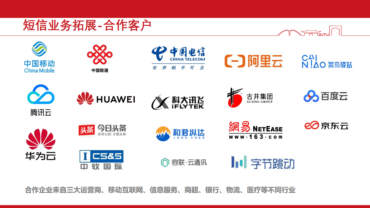 在國內開展、云通信短信業務、多媒體視頻短信、5G消息、5G流量、彩信等同時與多家大型企業(阿里、騰訊、華為、科大、百度、美團等)簽訂電信增值服務類型的合作,業務覆蓋面廣與生活息息相關,產品類型種類繁多如:驗證碼收取、業務通知提醒、生活繳費通知、各類商品活動促銷通知,信息變更等。